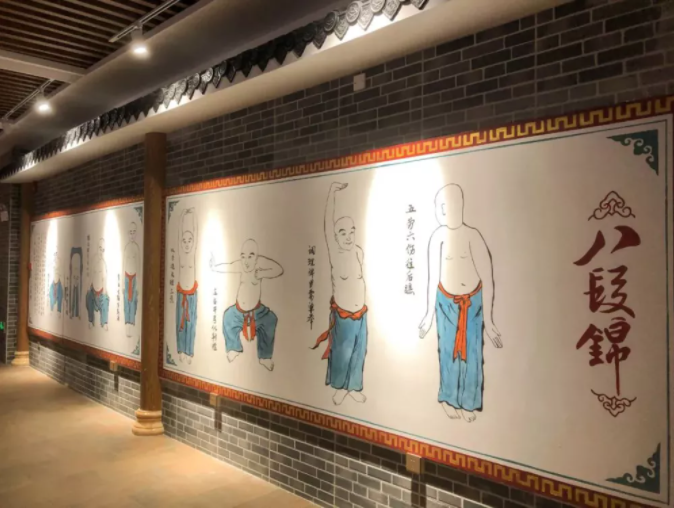 養(yǎng)生健康館的長廊刻畫著八段錦的招式,八段錦功法是一套獨(dú)立而完整的健身功法,起源于北宋,至今共八百多年的歷史。整套動(dòng)作柔和連綿,有松有緊,動(dòng)靜相兼;氣機(jī)流暢,骨正筋柔。
